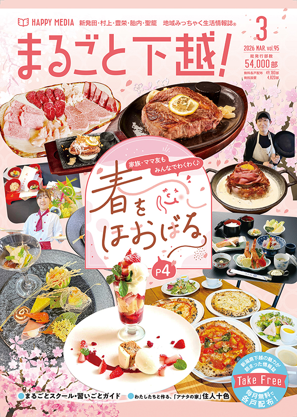 まるごと下越!は、新潟県の北側に位置する下越エリア (新発田市・村上市・新潟市豊栄・胎内市・聖籠町)のご家庭に ポスティングしているフリーマガジン。 内容はショッピング、おでかけ、グルメなど、 衣食住全般の暮らし関連情報が盛りだくさんです!