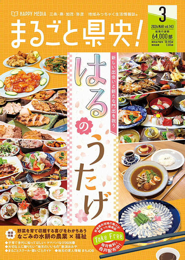 まるごと県央!は、新潟県の真ん中に位置する県央エリア (三条市・燕市・加茂市・弥彦村)のご家庭にポスティングしているフリーマガジン。 内容はショッピング、おでかけ、グルメなど、 衣食住全般の暮らし関連情報が盛りだくさんです!